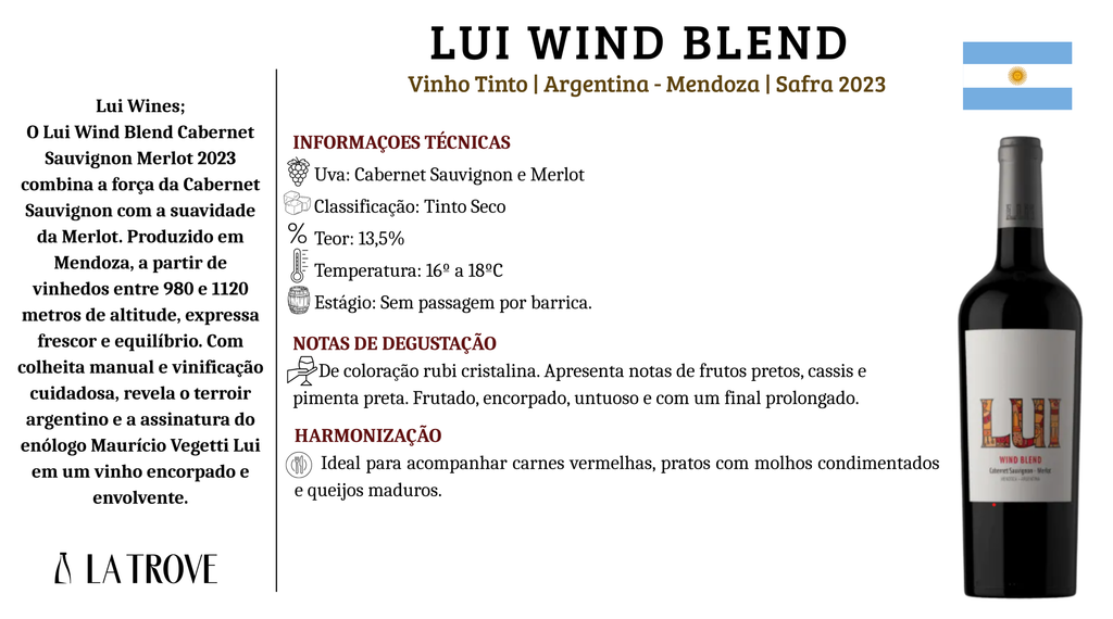 Harmonização: Ideal para harmonizar com carnes vermelhas, especialmente file mignon, costelas de cordeiro ou bifes grelhados. Também vai bem com massas em molho robusto e queijos curados.