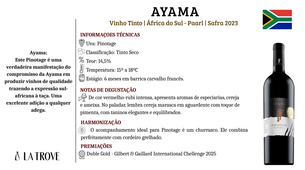 Harmonização: O acompanhamento ideal para Pinotage é um churrasco. Ele combina perfeitamente com cordeiro grelhado.