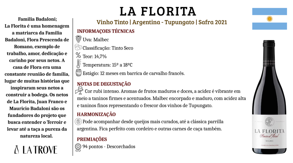 Harmonização: Tinto versátil que pode acompanhar desde queijos mais curados, até a clássica parrilha argentina. Fica perfeito com cordeiro e outras carnes de caça também.