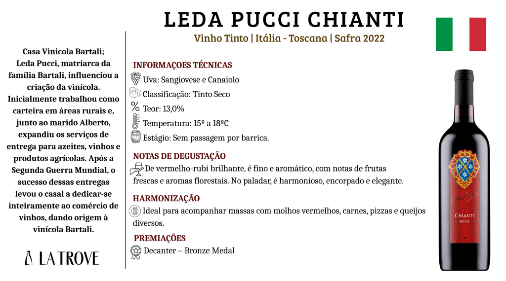 Harmonização: massas, carnes vermelhas, queijos e frutos do mar.