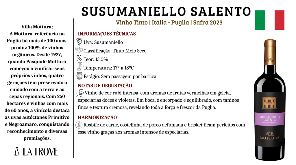 Gustativo: Em boca é encorpado, intenso e potente sem perder o equilíbrio graças ao frescor maior dessa variedade. Taninos finos deixando a boca cremosa e fácil de repetir um novo gole. Harmonização: Rosbife de carne, costelinha de porco defumada e brisket ficam perfeitos com esse vinho graças aos aromas intensos de especiarias